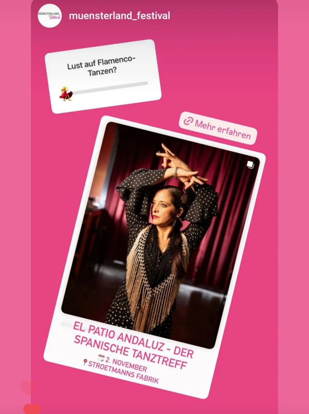 Und was gehört noch zu einem "richtigen spanischen Abend"? Richtig: spanische Klänge - und Flamenco mit Camen Lopez, einer außergewöhnlich ausdrucksstarken Künstlerin, die den traditionellen Flamenco mit modernen Elementen des Flamenco nuevo vereint. In Münster geboren, wuchs sie in einem andalusischen Elternhaus mit dem Flamenco auf. In über 30 Jahren Bühnenerfahrung u.a. mit Auftritten für das spanische Ministerium, im Stadttheater Münster, Berlin, der Open-Air Bühne Hamburg, Flamencofestivals in Hamburg, Düsseldorf und Würzburg hat sie ihren Tanz immer weiter perfektioniert.
